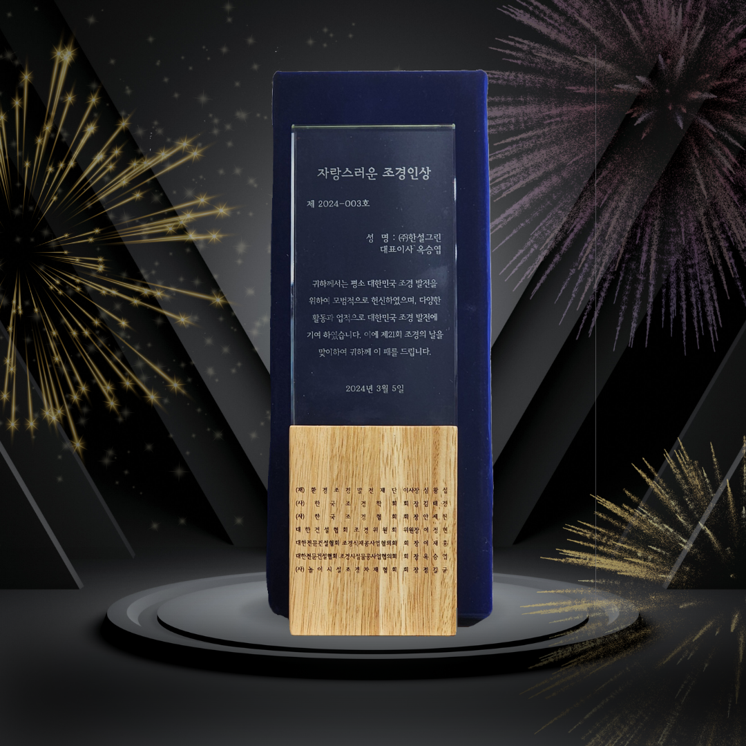 지난 3월 5일, 옥승엽 대표이사님이 대한민국의 조경 발전을 위하여 모범적으로 헌신하고, 다양한 활동과 업적으로 대한민국 조경 발전에 기여하여 자랑스러운 조경인 상을 수상하였습니다.