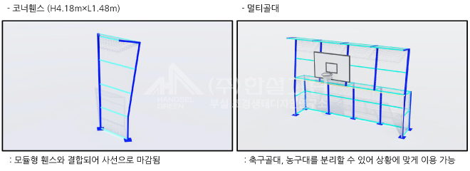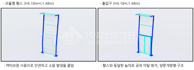 : H4.0이상의 높이로 밖으로 이탈되지 않아 이용자와 외부환경에 안전한 공간을 제공합니다.: 벽체 판재에서 발생되는 소음을 저감할 수 있는 소재를 이용하여 높은 내구성과 사용에 의한 변형이 없는 제품입니다.