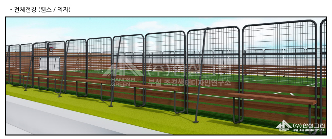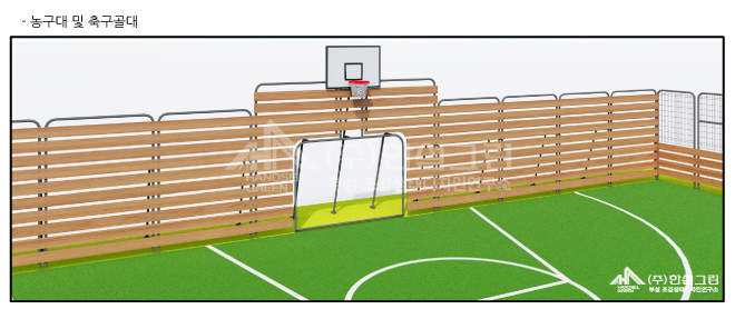 : 주변 공간과의 분리가 필요하거나 장소가 협소하여 공의 이탈이 우려되는 현장에 적용 할 수 있도록 휀스 전체를 높이2.6M로 조성하고, 목재와 메쉬휀스를 결합하여 시야를 확보한 제품입니다.
